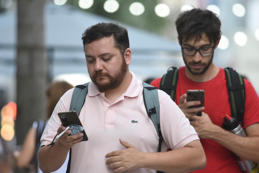 Camino con el celular en mano, luego existo. Postales como ésta se reproducen todos los días y a cualquier hora en cualquier lugar concurrido de la ciudad capital. Crédito: Mauricio Garín