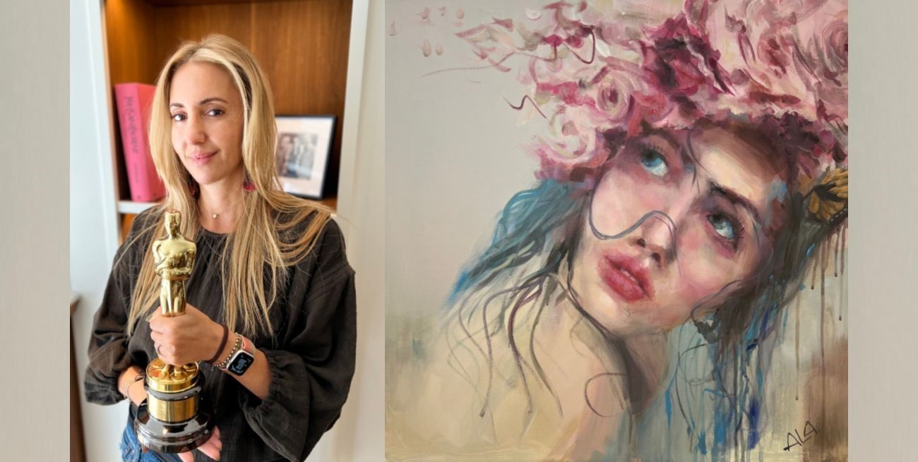 Alina posando con el Oscar obtenido por los efectos visuales de “Una historia extraordinaria”, dirigida por Ang Lee; al lado, el cuadro “Renacer”, de la serie “Living your dreams”: su propio recordatorio de que hay que reinventarse para nuevas metas. Fotos: Gentileza Alina Añón