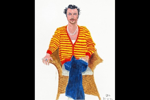 Styles aparece sentado, vestido con una chaqueta roja y amarilla, un collar blanco de de perlas y un pantalón azul. El trabajo lo inició Hockney en mayo de 2022, cuando el cantante lo visitó en su estudio francés.