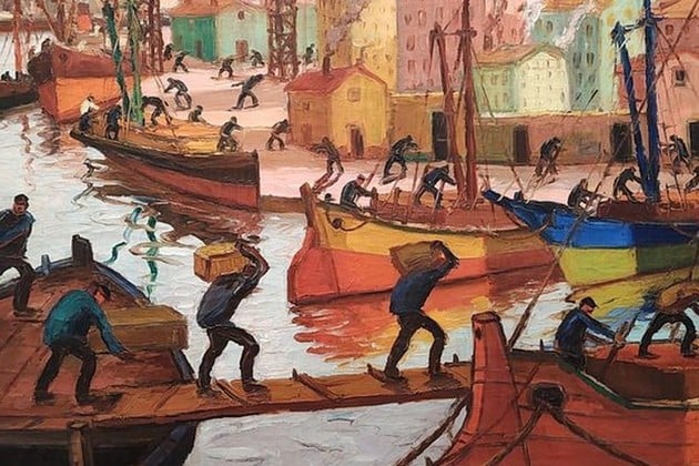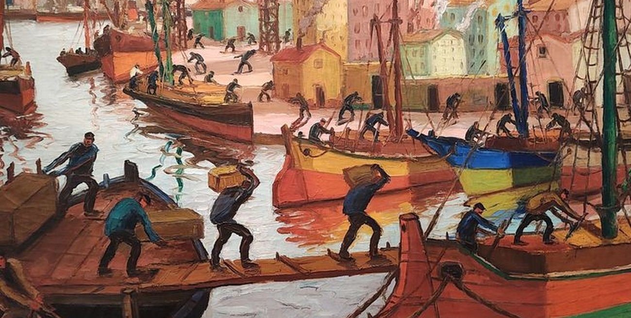 Desde las entrañas del puerto, hasta los rincones íntimos del hogar, las obras elegidas son reflexiones sobre las dimensiones del trabajo y la dignidad humana. Con estilos y miradas de pintores diversos entre sí, pero unidos por su mirada comprometida.