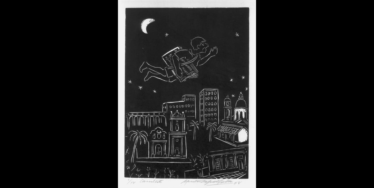 Precisamente, dentro del inventario de Santa Fe Arte, figura una obra donde claramente se observa el estilo de Zapata Gollán que podría ubicarse dentro de ese marco referencial y que se reproduce como apertura de esta nota. Fuertemente metafórica, muestra un “canillita” que sobrevuela un espacio que claramente es santafesino, bajo la luz de la luna, mientras “vocea” para vender su producto.
