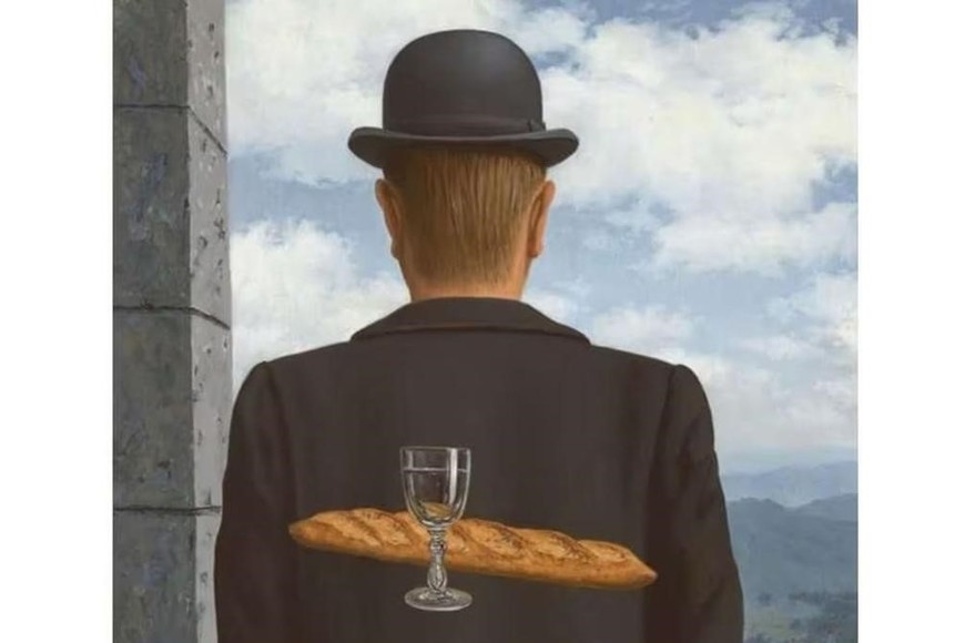 Dentro del lienzo, al mirar por la ventana se observa un paisaje sereno y montañoso y un cielo lleno de nubes, que parece ajeno a la extraña visión de una baguette y una copa de vino flotando en el aire justo detrás del protagonista de la pieza.