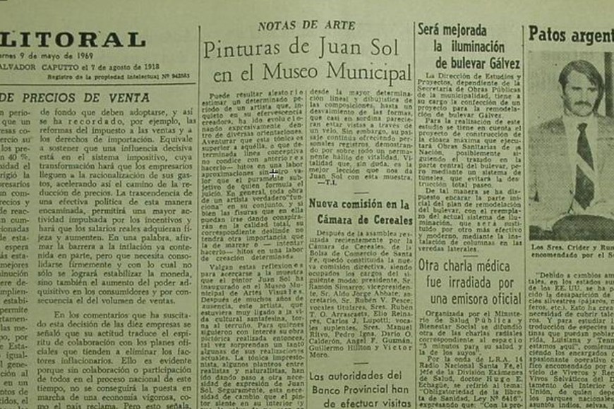 Un relevamiento en las antiguas ediciones de El Litoral permitieron hallar referencias respecto a una exposición de Juan Sol, que fue concretada en 1969 en el Museo Municipal de Artes Visuales. Que implicó, de acuerdo a las crónicas de la época, el regreso a Santa Fe de este artista, que como se dijo previamente estuvo ligado a la vida cultural de la ciudad.