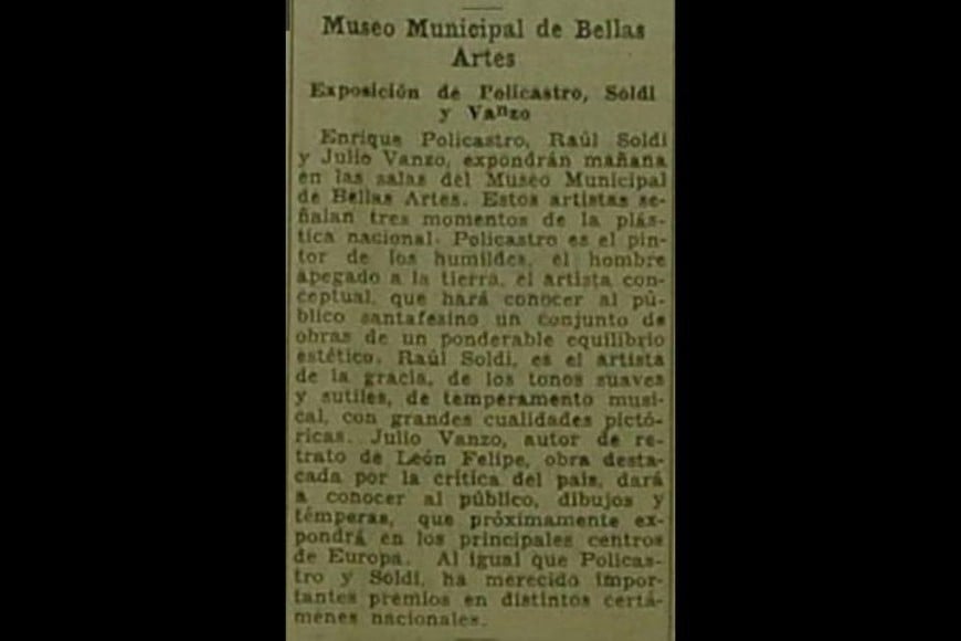 Un día después, otro diario santafesino de referencia como era El Orden, expresó: “los expositores demarcan dentro de la pintura argentina, tres momentos de equilibrio estético y perseveran en sus módulos estilísticos, que los sitúan libremente en la realización de su obra. Mientras Policastro, se adentra en la vida de los humildes para descubrir sus estados emocionales y encontrar el acento terrígeno, hasta identificarse con el dolor y las etapas sociales de un sector argentino, Soldi va hacia otras esencias llenas de sutilezas y gracias tonales que le permiten ofrecer un variado conjunto de trabajos finamente estéticos”.