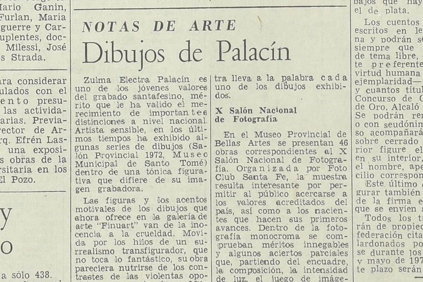 En septiembre de 1972, Palacín realizó una muestra en la galería de arte Finuart, que fue reseñada por el mentado Taverna Irigoyen en la edición de El Litoral del 13 de septiembre. Reproducimos a continuación los conceptos esgrimidos allí por el crítico. “Artista sensible, en los últimos tiempos ha exhibido algunas series de dibujos dentro de una tónica figurativa que difiere de su imagen grabadora. Las figuras y los acentos motivales de los dibujos que ahora ofrece en la galería de arte "Finuart" van de la inocencia a la crueldad. Movida por los hilos de un surrealismo transfigurador, que no toca lo fantástico, su obra pareciera nutrirse de los contrastes de las violentas oposiciones de nuestra época”.