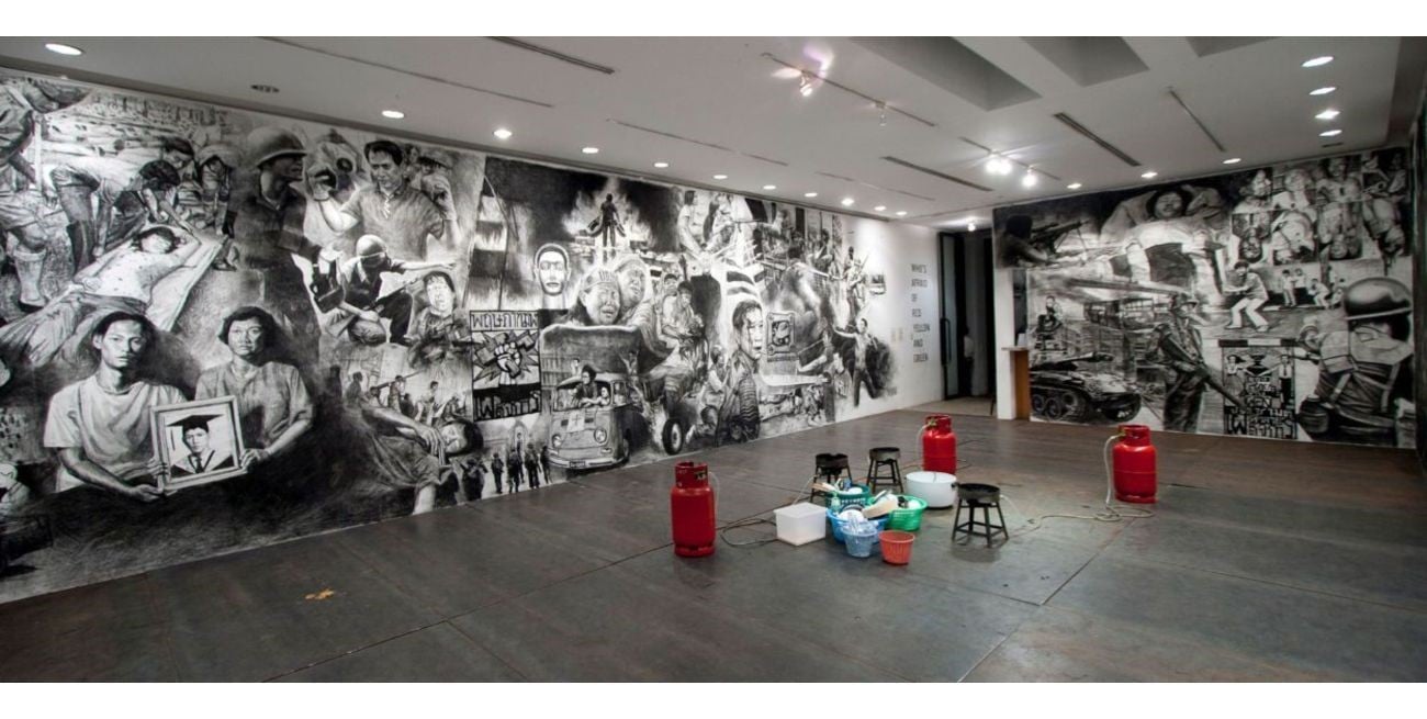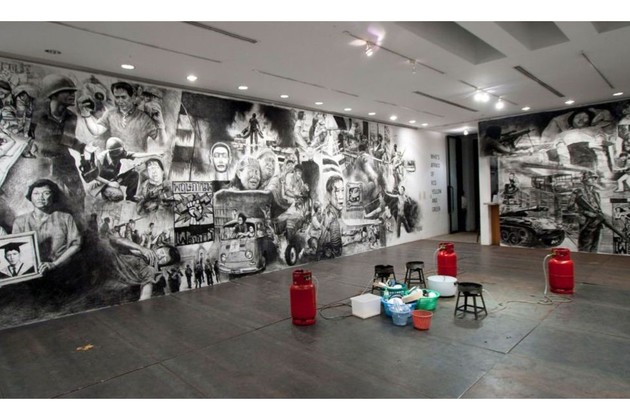 Rirkrit Tiravanija, Sin título, (“Police the police”), 2011. Lápiz sobre la pared, utensilios de cocina, acero. Foto: Gentileza Gavin Brown