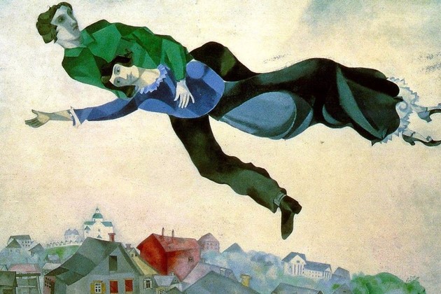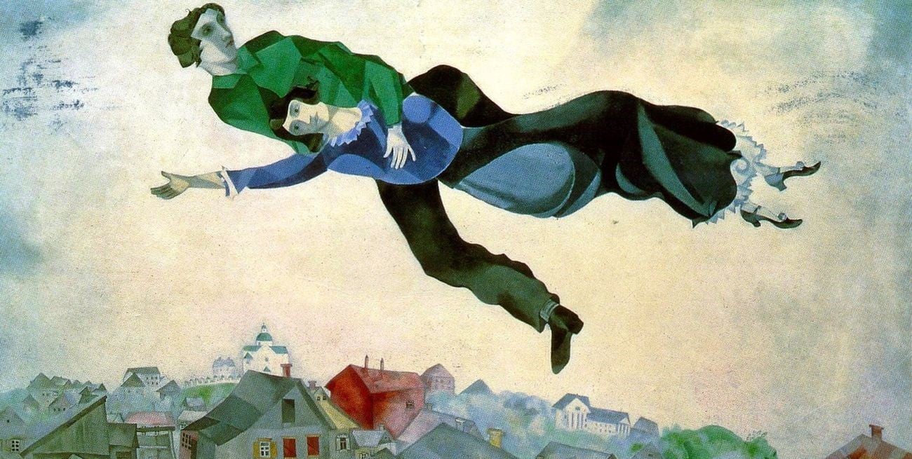 La pintura muestra a Chagall y su esposa Bella flotando sobre Vitebsk, su ciudad natal. El vuelo, que desafía leyes físicas, es una metáfora del amor que supera lo terrenal y lo cotidiano.