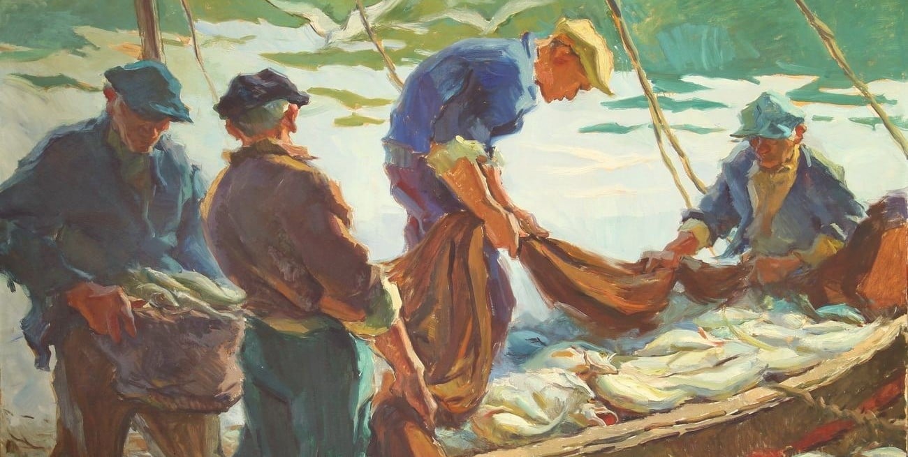 El repertorio de obras mencionado en la muestra sirve para reconstruir el universo del artista. Títulos como "Trabajadores del mar", "Llegada de la pesca", "Actividad matinal" o "Última hora" remiten a distintos momentos de la jornada laboral, pero sin jerarquías narrativas.