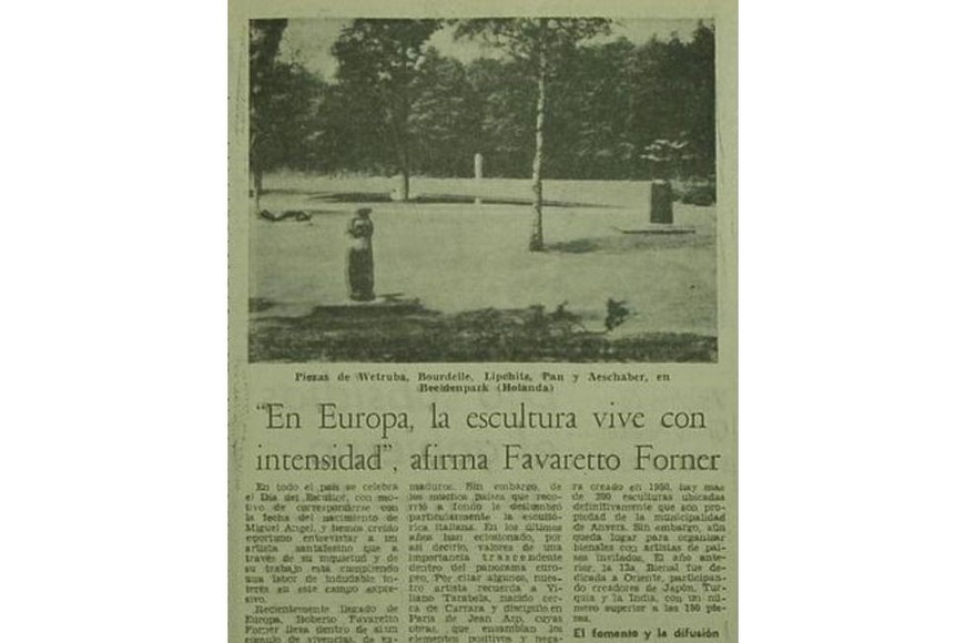 “Así lo debe haber entendido Roberto Favaretto Forner al emplazar un grupo de sus esculturas en los jardines de su taller. Allí, entre los verdes más humildes y la naturaleza más libre, exhibe parte del producto de cinco años de labor intensa y seria”, señala luego.