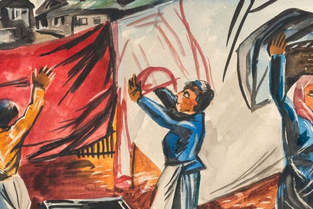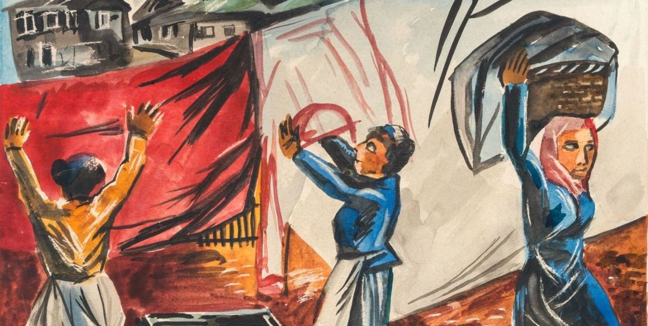 Fragmento de “Las lavanderas”, aguada sobre papel de Natalia Goncharova, que refleja su maestría en la fusión de tradición y modernidad. Foto: Colección Eliezer Perel