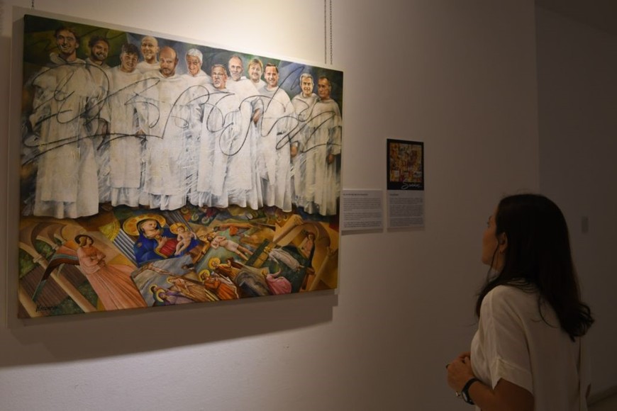 “De ese grupito que se llevaba que se llevaba muy mal, y que eran enemigos, y que lo molestaban porque se dedicaba a pintar y no a rezar, en la pesadilla que tuvo una noche sueña que esos 12 compañeros le pisan sus obras. Es una ardid para no solo mostrar estos personajes, sino también para contar cómo estas obras son pisoteadas con gusto o de manera simbólica por estos compañeros. Es captar una historia algo posible o inverosímil, pero que tiene que ver con los sueños. En este caso puse como personajes a mis nietos, a mis yerno, un amigo, mi hermano, otro yerno, otro yerno, mis sobrinos, mis cuñados: a algunos les gustó y otros no sé”, agrega entre risas”.