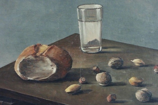 Las naturalezas muertas fueron un eje en su producción. Frutas, botellas, jarras y floreros aparecen en composiciones equilibradas, sin excesos.