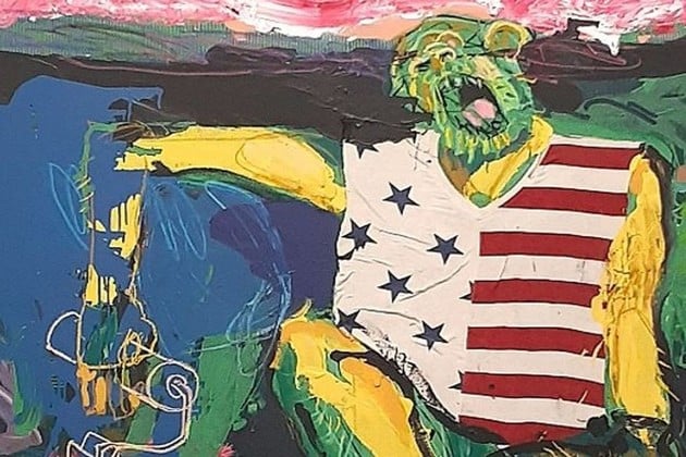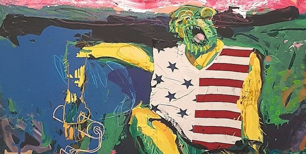Esta es, probablemente, la obra más desgarradora y políticamente incorrecta de toda la serie. Un homonstruo verde, mitad bestia y mitad hombre, aúlla bajo un sol indiferente mientras lleva cosida a la carne la bandera de Estados Unidos. El título lo dice todo: Caín llorando al perder su condición de nómade. Una provocación teológica y política que Malara lanza sin pedir permiso.