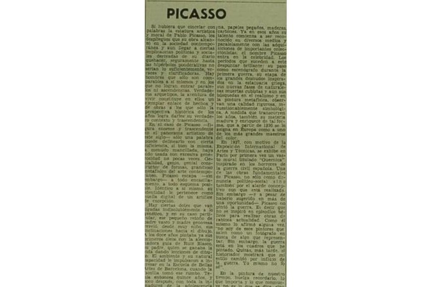 "Si hubiera que cincelar con palabras la estatura artística y moral de Pablo Picasso, los despliegues que su obra alcanzó en la sociedad contemporánea y aun llegar a ciertas implicancias políticas y sociales derivadas de su diario quehacer, seguramente hasta las hipérboles ponderativas no serían lo suficientemente, veraces y clarificadoras", escribió,