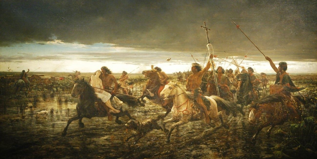 La tensión social y política del siglo XIX también está presente en "La vuelta del malón" de Ángel Della Valle, donde el drama colonial y la visión romántica del "otro", sintetizado en la figura del indígena, se reúnen en una escena violenta.