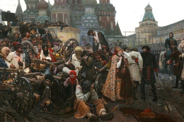 La escena remite a la represión ordenada por Pedro el Grande contra los streltsí, un cuerpo militar que se había sublevado. Pero más allá del hecho histórico, lo que interesa a Súrikov es el clima, el momento previo a la ejecución.