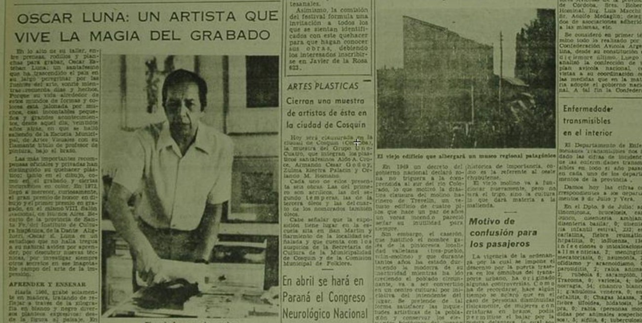 “En lo alto de su taller, entre prensas, rodillos y planchas para grabar, Oscar Esteban Luna: un santafesino que ha trascendido el país en su largo peregrinar por las fuentes del arte, sonríe mientras recuerda días y hechos. Porque su vida alrededor de estos mundos de formas y colores está jalonada por muchos, casi incontables pequeños y grandes acontecimientos, desde aquel día, 22 años atrás, en que se halló saliendo de la Escuela Municipal, de Artes Visuales con su flamante título de profesor de pintura bajo el brazo”.