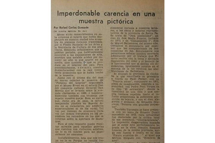 El 2 de abril de 1978 Rafael Carlos Quesada, de la agencia de El Litoral que funcionaba en Buenos Aires, publicó el artículo titulado "Imperdonable carencia en una muestra pictórica".
