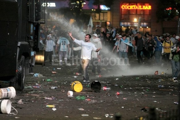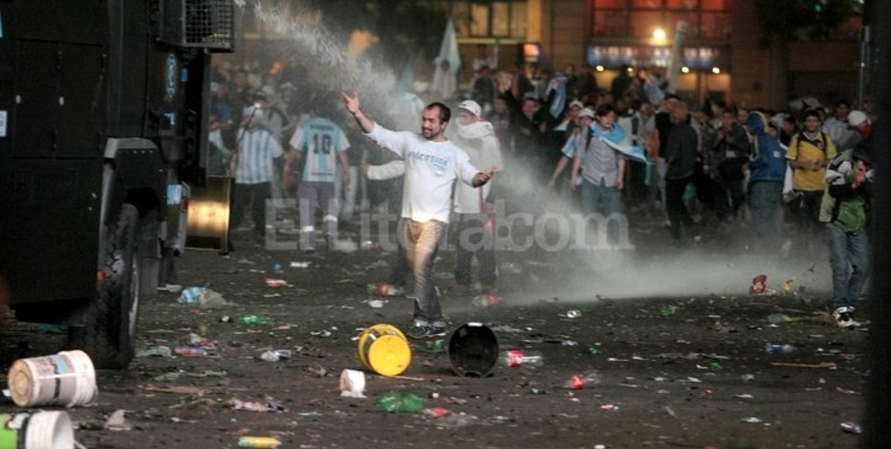 ‘Me senté y sabía que no había a quién llamar. Rogaba que pasaran rápido para que destrozaran los menos posible‘, dijo el comerciante, identificado como Itaí, propietario de un negocio ubicado en Cerrito y Lavalle. El hombre afirmó al canal Todo Noticias (TN) que los agresores ‘rompían por romper, porque se habían llevado lo que querían, que era el alcohol‘. Comentó que al llegar al local se encontró con ‘todos los vidrios rotos, la chopera... se llevaron la computadora, sombrillas, sillas, las botellas, rompieron la barra, tiraron la comida guardada en las heladeras buscando bebidas, estaba todo por el piso‘. ‘Vivo en la Argentina, ya sé como funcionan las cosas y me voy a tener que hacer cargo yo con mis amigos‘, se resignó el comerciante, quien lamentó: ‘Así vivimos, vivimos echándole la culpa a los demás, pero la culpa es nuestra; somos nosotros los que tenemos que reeducarnos para que esto no pase más‘. ‘Me tocó ver por televisión cómo robaban en mi local‘, sintetizó. Los incidentes se registraron pasadas las 21 y se extendieron durante más de tres horas, con un resultado de al menos 15 policías heridos a causa de las pedradas y unos 50 detenidos. Un grupo de violentos saqueó comercios y rompió vidrios en edificios y semáforos, en medio de la celebración tras la derrota 1-0 de Argentina ante Alemania en la final del Mundial de Brasil.
