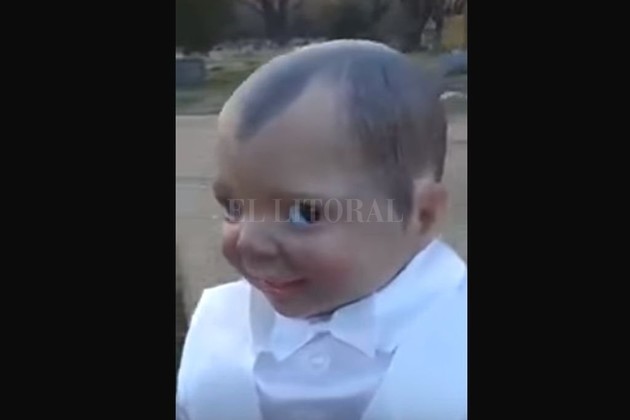 El siniestro personaje impactó a los testigos. Parece un muñeco, pero está recubierto de un material muy similar a la piel humana. Además, su dentadura muestra colmillos, tiene cabellos casi naturales y una mirada penetrante y lúgubre que sigue permanentemente a las personas que se le acercan.