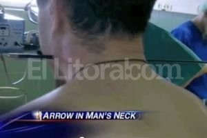 No fue Cupido. Konstantine Myakush de nacionalidad rusa sufrió un insólito accidente mientras paseaba con sus hijas. Una flecha perdida le dió de lleno en el cuello. Llamó a su esposa y salvó su vida de milagro.