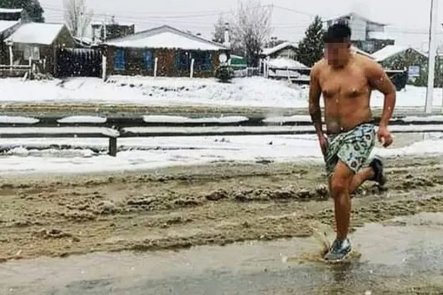 Según publicó el diario barilochense El Cordillerano, este viernes la foto que mostraba un hombre corriendo semidesnudo por Ruta 40 Sur, durante el intenso frio y la nevada que cayó en la jornada, se hizo viral en toda la ciudad.