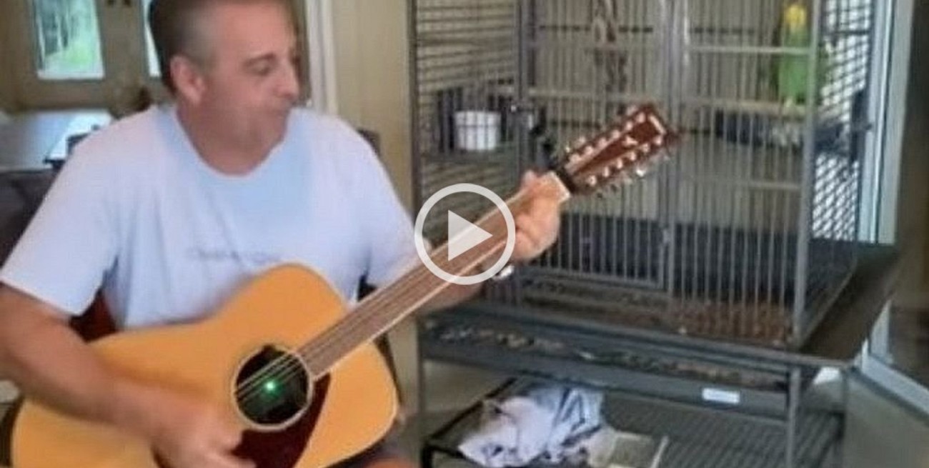 Las imágenes muestran cómo el ave emite gritos, “cantando”, mientras su dueño toca los acordes de la canción con su guitarra.