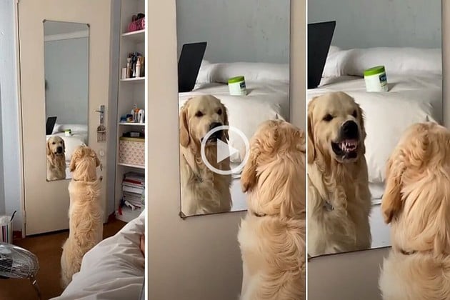 En el video aparece un can de raza golden retriever parado al frente del espejo. Al inicio, la mascota solo se mira, pero segundos después comienza a demostrar una enfurecida reacción al pensar que había otro animal.