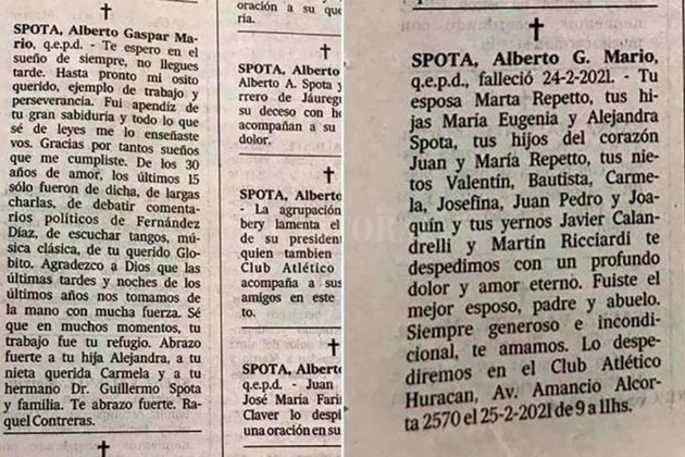 Un allegado a Spota, que estuvo en su velorio, dijo que lo de los avisos le parecía “una cargada”. “Yo siempre lo respeté mucho, no solo como persona sino como profesional: era un gran abogado. Todo eso que dicen, la verdad, no lo puedo creer”, confió.