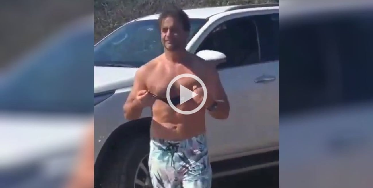 En el video, que se viralizó rápidamente en las redes sociales, se puede ver al mandatario uruguayo en traje de baño que camina en dirección a sus seguidores para saludarlos, mientras intenta colocarse el tabapocas al acercarse.