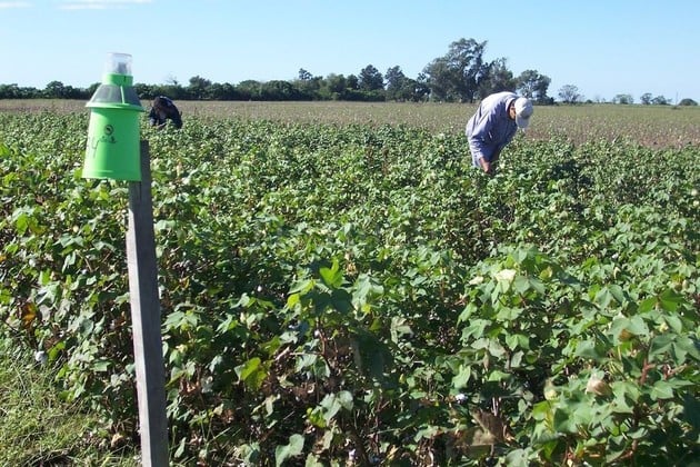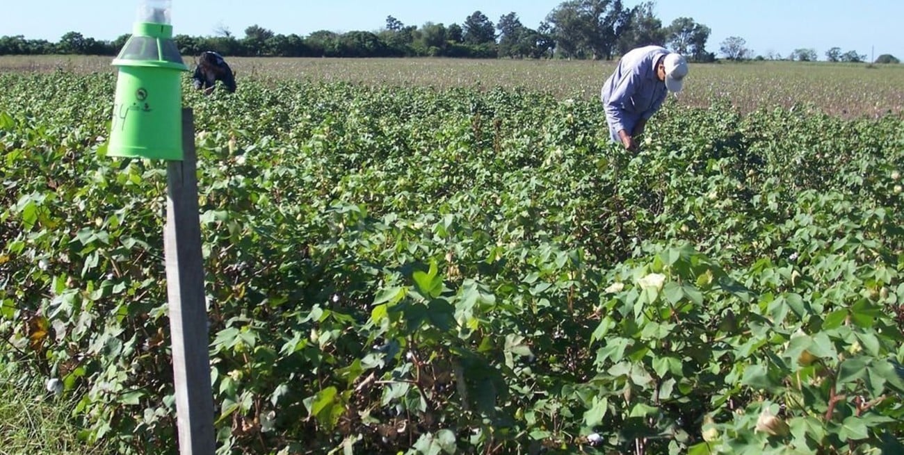 Lote de algodón, trampa con captura de picudo, en el noroeste del departamento Nueve de Julio. Foto: Informe Estimaciones Agrícolas.