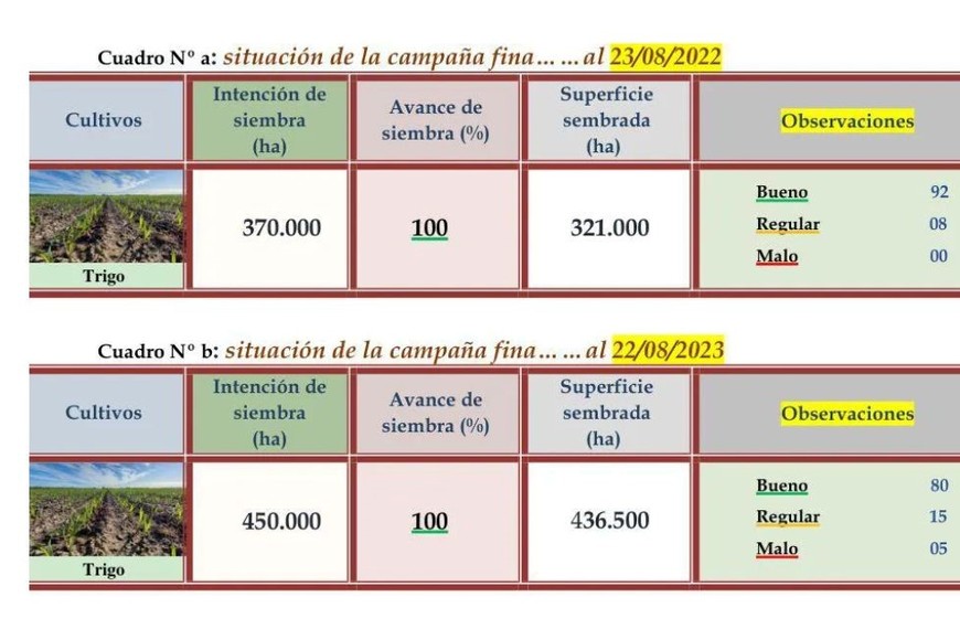 El monitoreo semanal del Sistema de Estimaciones Agrícolas (SEA), que difunde la Bolsa de Comercio de Santa Fe, muestra que al 22 de agosto, en los 12 departamentos bajo seguimiento un 80% de los lotes están buenos, un 15% regulares y el 5% malos. En 2022, las prorciones eran 92% bueno, 8% regular y no se reportaban cultivos en mal estado.
