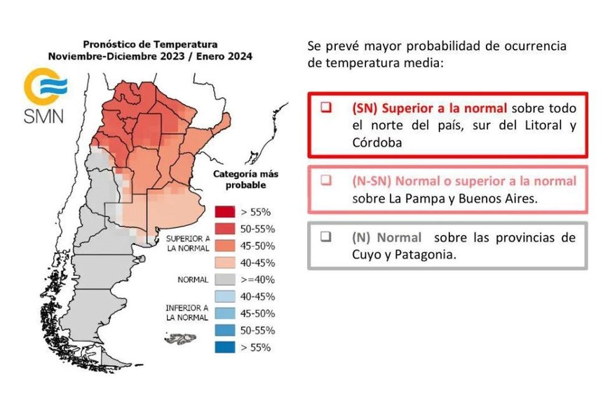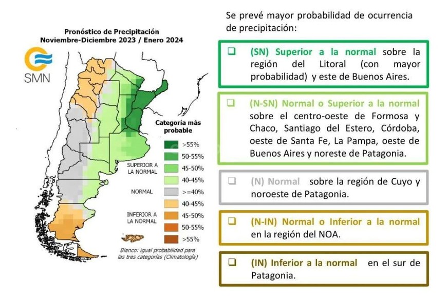 Teniendo en cuenta éste y otros indicadores, el SMN prevé lluvia trimestral superior a la normal sobre la región del Litoral (con mayor probabilidad) y este de Buenos Aires. Las precipitaciones totales del trimestre serían normales a superiores a las normales sobre el centro-oeste de Formosa y Chaco, Santiago del Estero, Córdoba, oeste de Santa Fe, La Pampa, oeste de Buenos Aires y noreste de Patagonia.