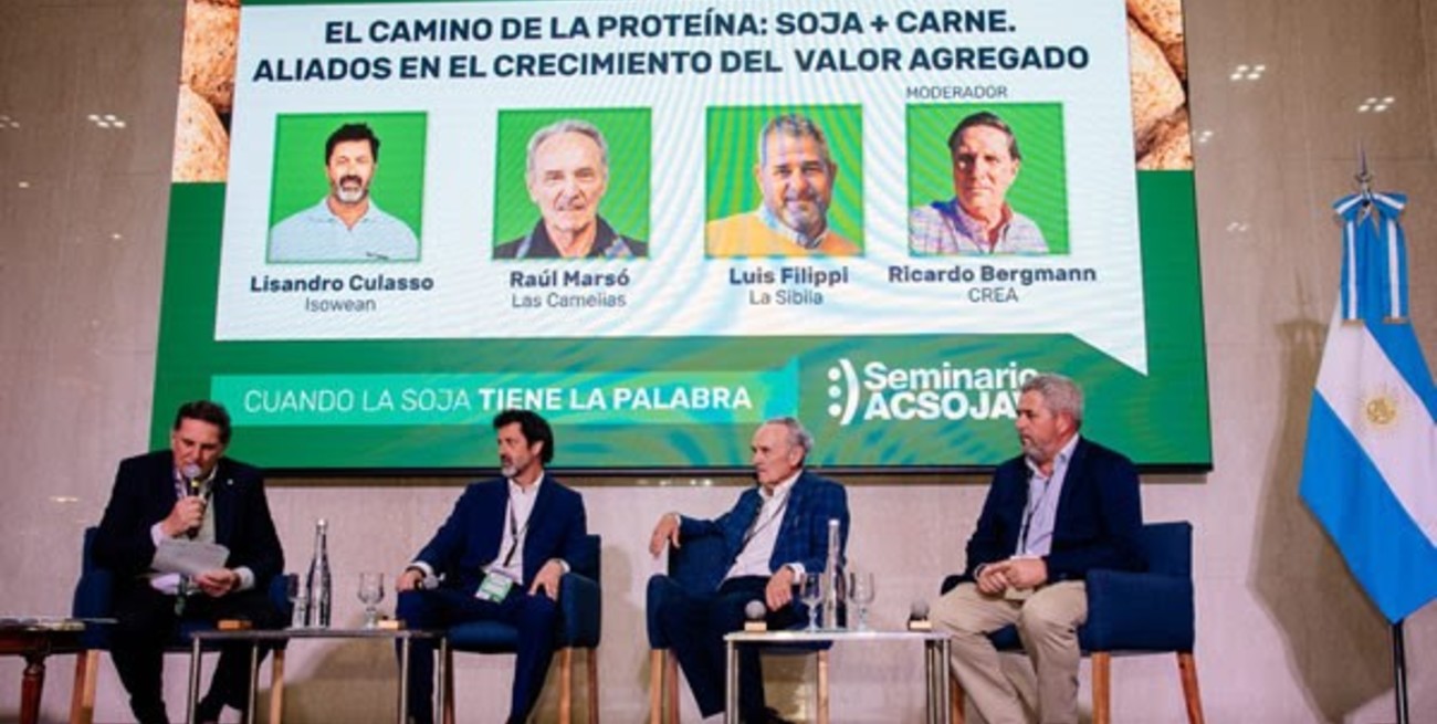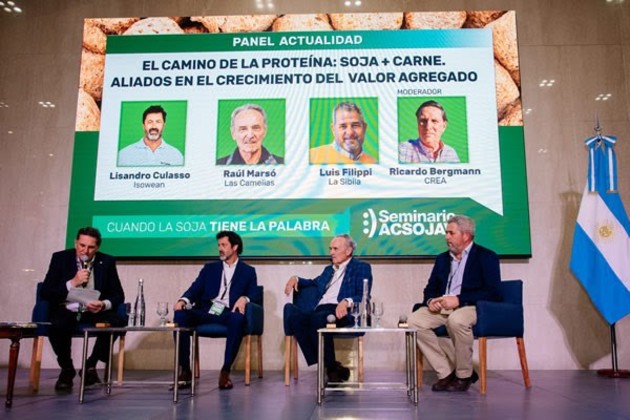 Durante el Seminario ACSOJA 2025, en la Bolsa de Comercio de Rosario, se desarrolló el panel “El camino de la proteína: soja + carne. Aliados en el crecimiento del valor agregado”, con la participación de Lisandro Culasso (Isowean), Raúl Marsó (Las Camelias) y Luis Filippi (La Sibila), bajo la moderación de Ricardo Bergmann (CREA).