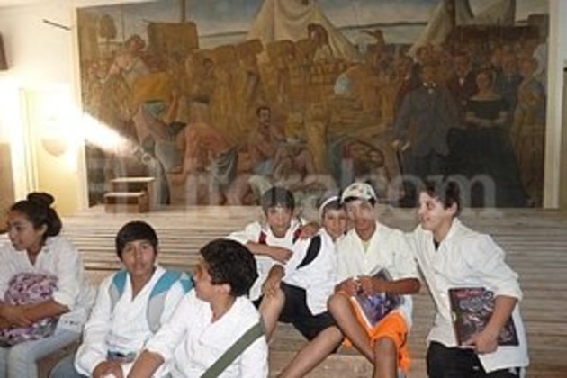Simbólico. Pasado, presente y futuro de Iriondo: el mural histórico y los chicos. El barrio está íntimamente ligado a las actividades educativas. Foto: Agencia Santo Tomé