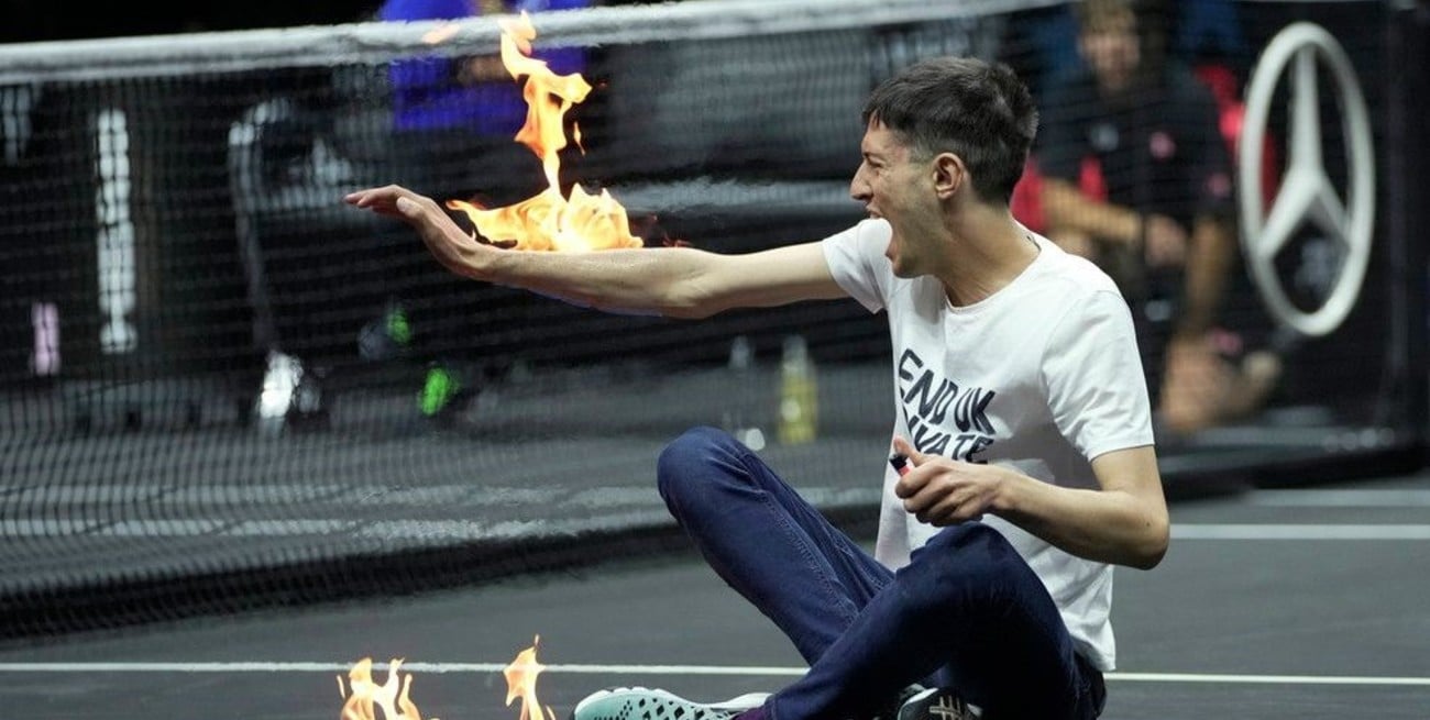 El activista por el cambio climático hizo su ingreso a la pista del O2 Arena en un alto del encuentro, cuando los tenistas ocuparon sus respectivos asientos para un descanso, y se prendió fuego el antebrazo derecho.