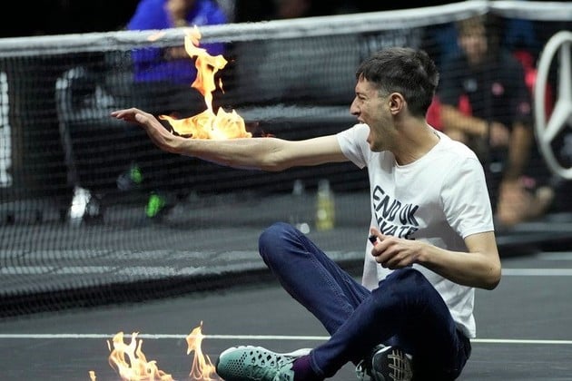 Un activista irrumpió este viernes en el partido que el argentino Diego Schwartzman disputaba ante el griego Stefanos Tsitsipas en el inicio de la Laver Cup y se prendió fuego a un brazo ante la sorpresa y el estupor de los espectadores en el O2 Arena de Londres, Inglaterra.