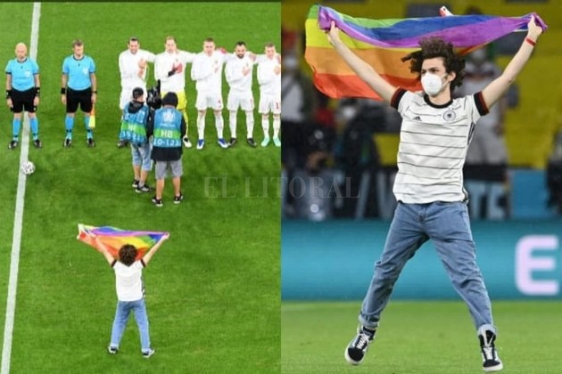 Un activista invadió la cancha este miércoles durante el partido entre Alemania y Hungría por la Eurocopa de fútbol, con una bandera del colectivo LGBTIQ+, en el momento del himno húngaro como forma de protesta.