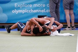 Amieva-Zelayeta lograron reponerse anímicamente de la dura derrota en semifinales frente a Holanda, para imponerse a Streli y Hajos por un doble 21-15, en media hora de juego bajo un intenso calor.
