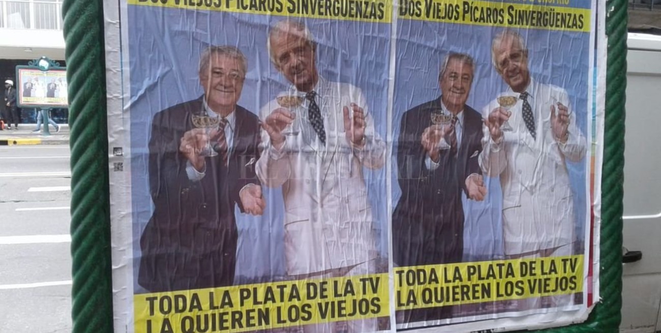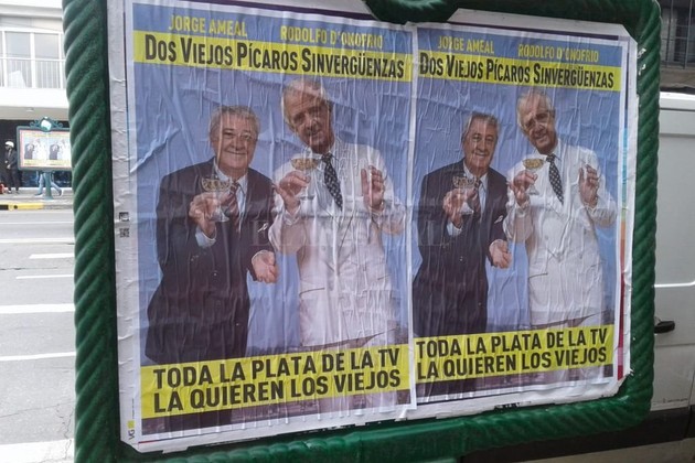 "Dos viejos pícaros sinvergüenzas. Toda la plata de la TV la quieren los viejos", dicen los afiches que tiene las caras de Ameal y D'Onofrio, presidentes de los dos equipos más grandes de Argentina.