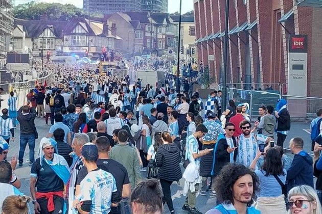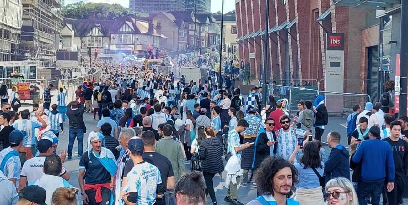 Pese a la distancia, cientos de hinchas argentinos se hicieron presentes en las inmediaciones del estadio y realizaron un banderazo para alentar al equipo. En las calles de Londres se vieron banderas argentinas con la cara de Lionel Messi y distintos escudos de clubes nacionales.