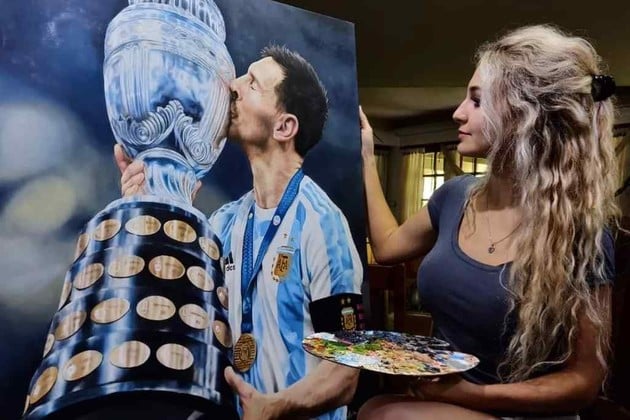 Agostina Mauro es una artista rosarina de 26 años que pintó un cuadro hiperrealista de Leo Messi besando la Copa América. La obra estuvo terminada en sólo un mes y fue ella misma a llevarsela hasta el predio de AFA. De todas maneras, por cuestiones sanitarias fue Claudio Tapia quien le entregó en mano la pintura al astro.