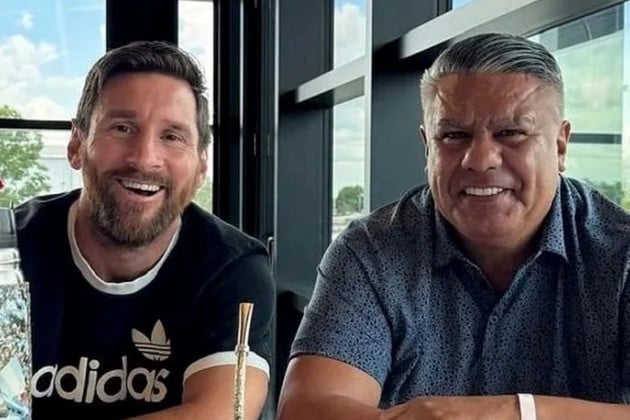 Lionel Messi, detrás de Leones FC, y Claudio "Chiqui" Tapia, presidente de la AFA.