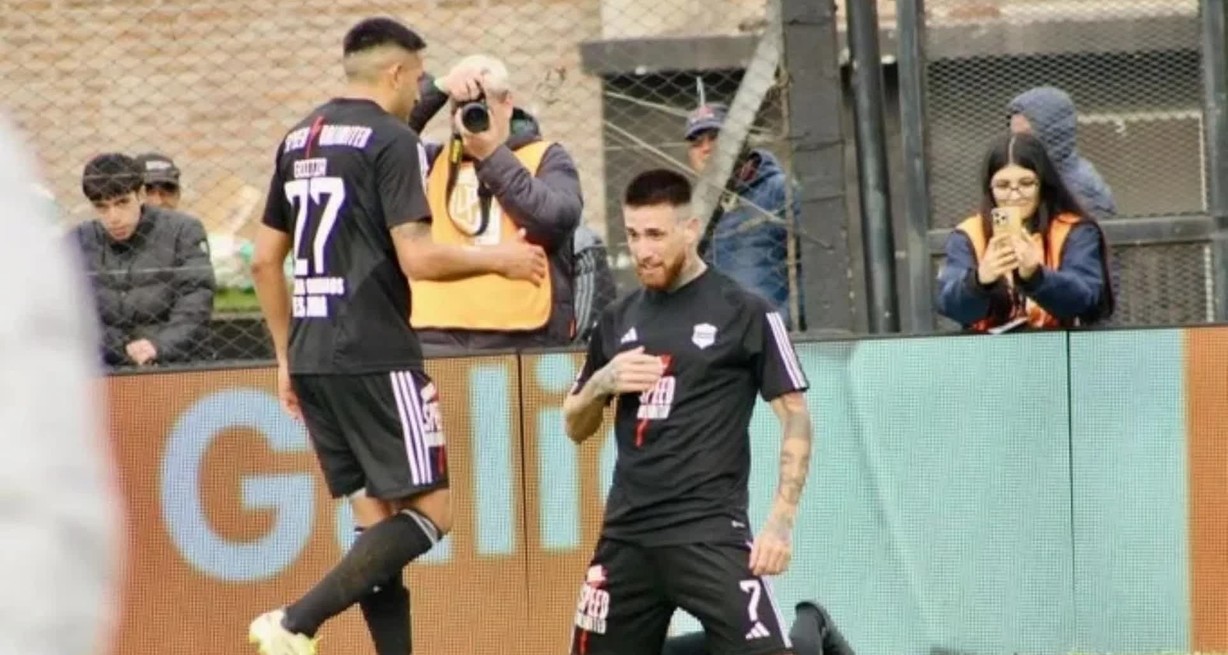 El primero de los festejos. Jonathan Herrera arrodillado después de marcar el gol que abrió el camino de la victoria de riestra sobre Atlético Tucumán. Gentileza