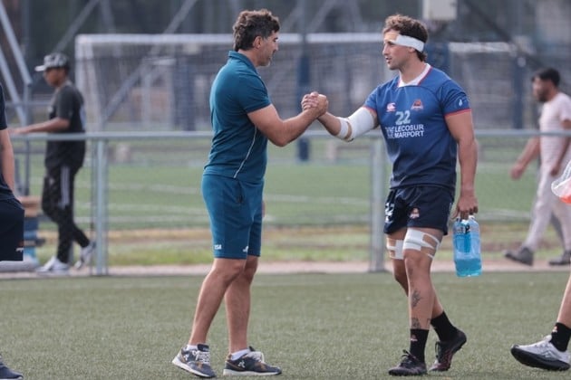 MIRADA PUMA EN CAPIBARAS. Juan Martín Fernández Lobbe, entrenador de Los Pumas que llegó acompañado de Andrés Bordoy, saluda a los jugadores de Litoral Rugby antes del debut de este sábado en Rosario. Foto: Martín Perego / Prensa Capibaras.