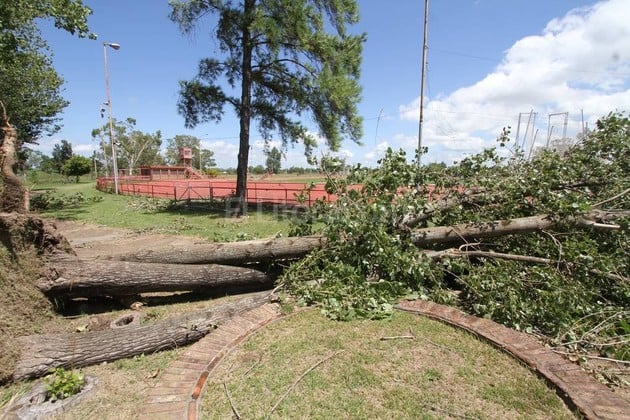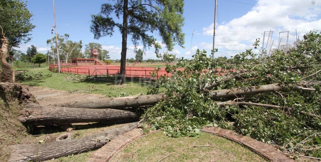 Si hay algo contundente es que las tormentas de los últimos tres años arrancaron toda la forestación existente. Parece un desierto: la pista, edificios y nada más. En lo estructural, los edificios no sufrieron daño, sí el equipamiento atlético específico. La Secretaría de Deportes Provincial mandó enseguida a reparar un juego de colchonetas y en estos días se reparan los parantes retorcidos del salto con garrocha, otro ya no sirve más. Los árboles que se plantaron en la década del 80, con el fin de brindar forestación, sombra, reparo, belleza al escenario deportivo, cayeron todos.