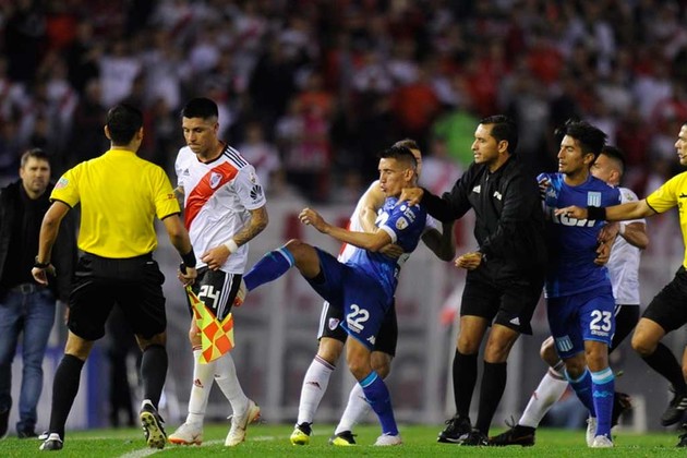 Se terminaba el partido que River goleaba a Racing por los octavos de final de la Copa Libertadores y Enzo Pérez no tuvo mejor idea que hacerle unos gestos de aparente burla a Ricardo Centurión. El partido se desmadró y hubo incidentes entre jugadores de ambos equipos. Los nombrados fueron expulsados.