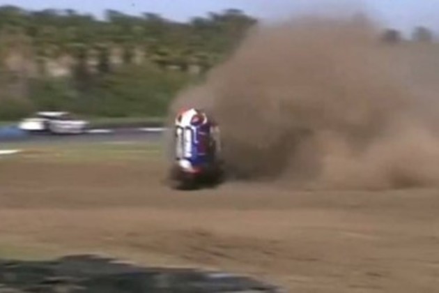 Las imágenes de la transmisión son elocuentes y muestran cómo el piloto pierde el control de su Honda y supera la cinta asfáltica. El impacto fue a tamaña velocidad que dio al menos ocho vueltas en el aire y superó la valla con los neumáticos de contención. Este golpazo lo obligó a abandonar la primera final.