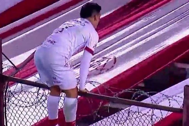 En el primer tiempo, el delantero protagonizó una insólita secuencia que comenzó con él marcado el gol, luego con su festejo colgado del alambrado y culminó con el gol anulado por el VAR.