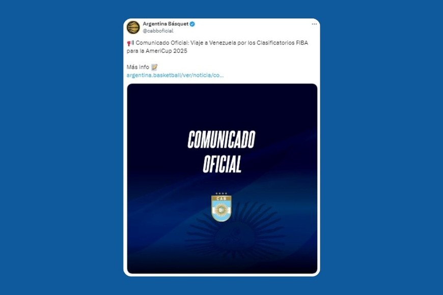 La Confederación Argentina de Básquet (CAB) ratificó que su seleccionado mayor masculina si viajará a Venezuela para disputar el anteúltimo partido de los Clasificatorios FIBA para la AmeriCup 2025.